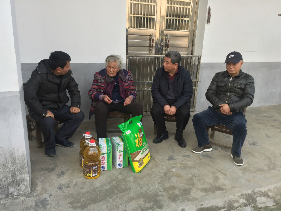 大家首先走访慰问了程会得家。因今年承包的鱼塘即将到期,程会得一家当天正在整修家中的小鱼塘,以便将鱼换地方喂养。支委委员梁伟荣和党员代表石斌赶忙带头帮助贫困户挑水泥,党员代表李姣、刘晋等则帮助贫困户清扫房间。忙活完这些之后,支部书记刘晖详细询问了贫困户今年集中收入状况和当前存在困难。随后,大家又来到贫困户曹进七家中,看望家中老人并送去慰问品。