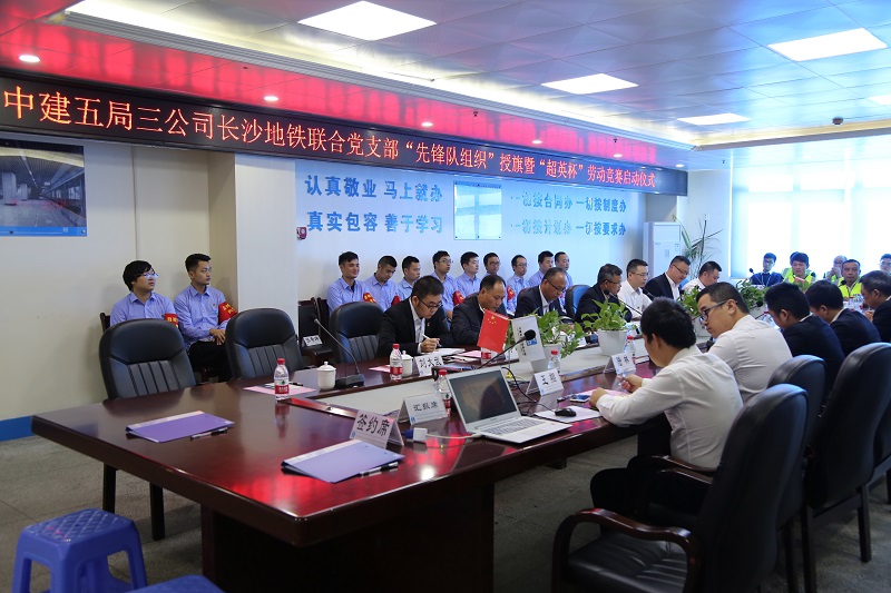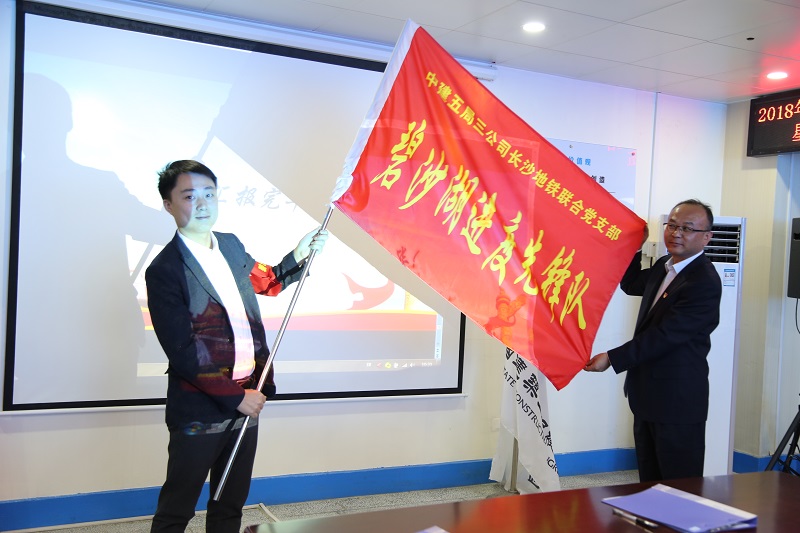 机电设备分公司相关负责人分别为4号线机电四标“碧沙湖进度先锋队”、4号线通信和信号项目“青年突击队”授旗,并代表公司对中建五局三公司和中国通号长期以来对长沙地铁建设的支持表示感谢。