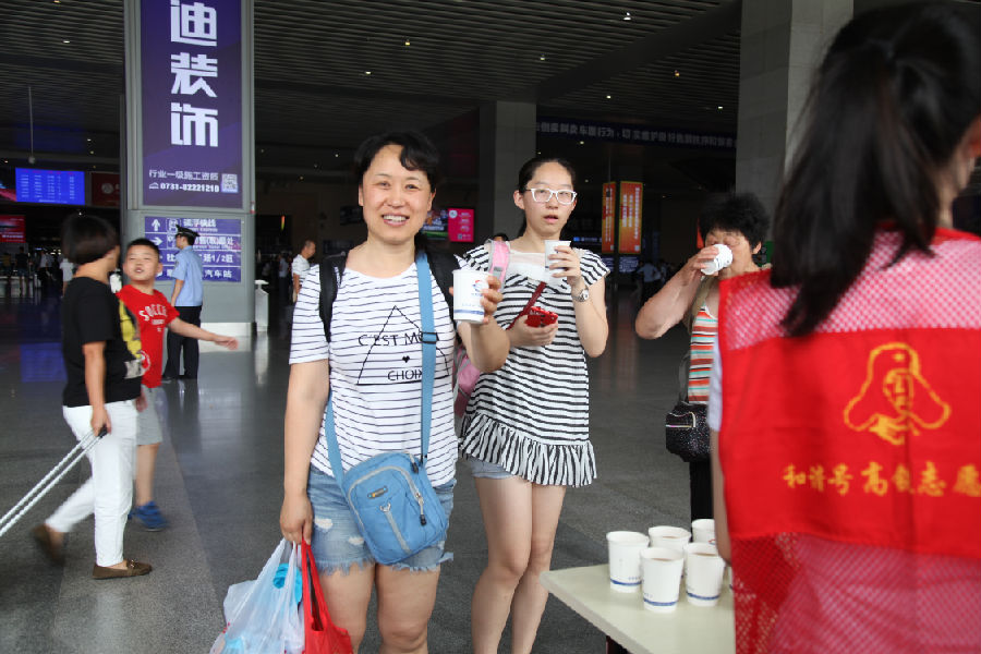 在火车南站各出入站口,轨道物业全体党员、团员身着红马甲,为等待列车的旅客送上一杯解暑凉茶,帮助他们降暑、解渴,安抚他们等待的心情;引导和指导旅客使用无人售票机,为旅客提供帮忙提行李等服务;解答旅客关于长沙出行的相关问题。