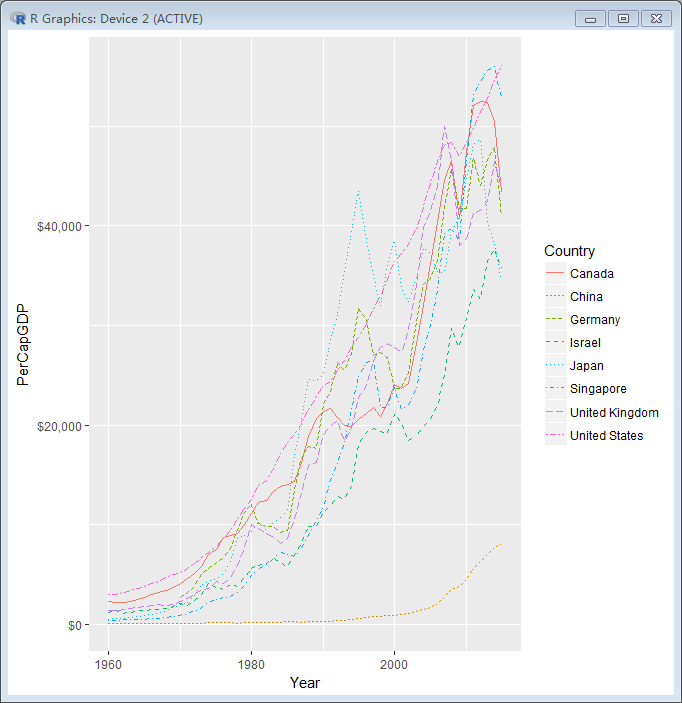 ggplot(gdp,aes(Year,PerCapGDP,color=Country, linetype=Country)) +