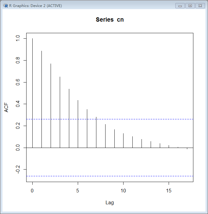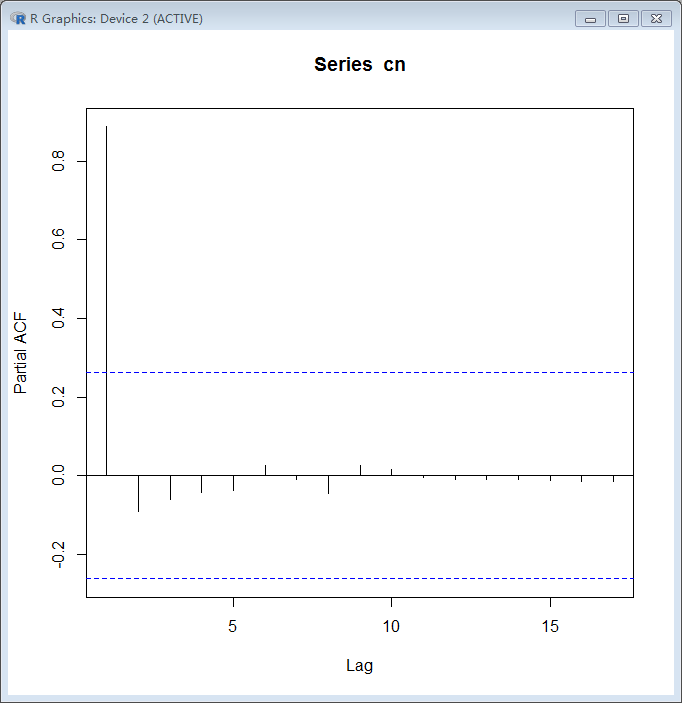 中国人均GDP序列的ACF和PACF。这些图表明时间序列是不平稳的(平稳性要求时间序列的均值和方差不随时间变化)。我们通过差分的变换方式进行修正,但找出适合的差分次数是比较繁琐的过程,我们可以利用forecast包确定最优差分次数。