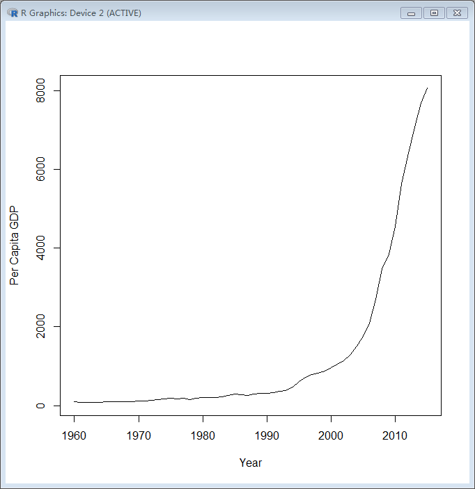 plot(cn,ylab="Per Capita GDP", xlab = "Year")