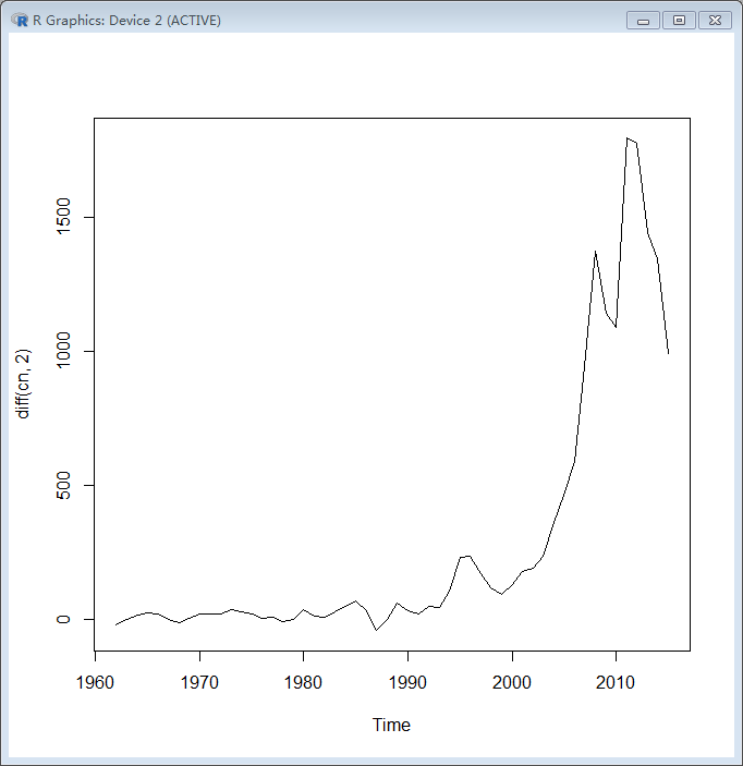 鉴于GDP数据是按照时间顺序统计,描述和呈现序列的波动,1960年-2015年构成了序列长度为56的观察值序列,根据时间序列的统计性质,以及对序列的平稳性特征进行识别(时序图),因为其上升的趋势表明,观察值序列为非平稳序列,故采用差分运算进行修正,再通过自回归移动平均模型拟合。在上述案例中,我们基于R语言实现时间序列分析: