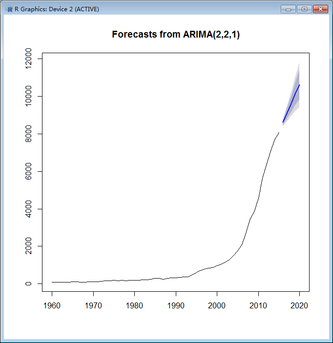 通过使用forecast函数可视化,我们可从上图得出实线为点预测,阴影部分为预测的置信区间,即中国未来GDP仍保持增长趋势。(文/曾冠军)