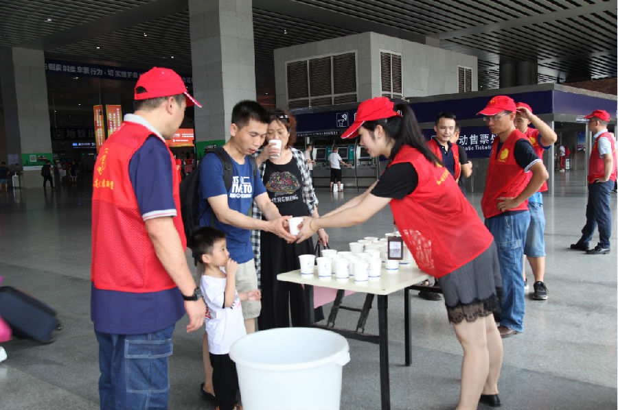 七月的长沙,如火如荼进行着的世界杯热浪从遥远的异国他乡疯狂地感染着星城的每一个人,为这个绚烂的夏日增添了太多的精彩。长沙火车南站,中南地区大型的综合性交通枢纽,每一天都热情地张开怀抱迎接着八方来客——远赴他乡求知的学子、行万里路看世界的游子、辛勤劳作的城市建设者……进入七月暑运时期,更是车水马龙,人潮蜂拥。酷暑的长沙,湿热难当,旅途的人们虽脸上流淌如淋雨般的汗水,却仍洋溢着灿烂的笑容,为那即将到达的远方,那里有思念已久的亲人,有美不胜收的景色,更因有出站层身着红马甲志愿者们的热情指引和双手奉上的一杯解暑凉茶。
