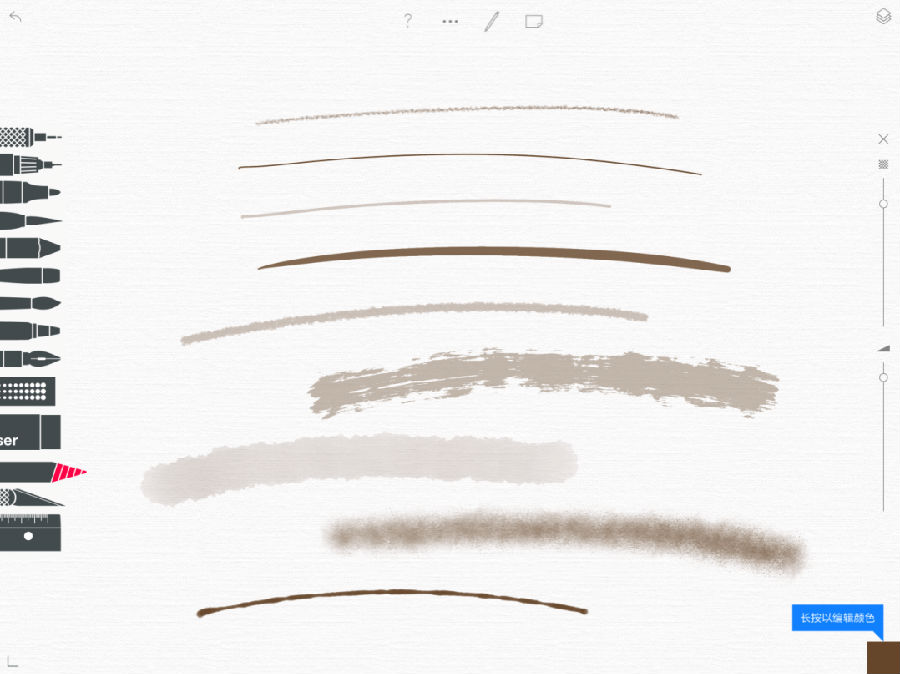 首先试试软件自带笔刷,Sketches的自带笔刷有针管笔、水性笔、硬头水彩笔、软头水彩笔、铅笔、排笔、毛笔、喷枪、钢笔9种,除此之外还有橡皮、自由填充、自由选区、尺子、颜色混合器等工具,右侧还可以自由调节笔刷大小、颜色和透明度,可以说安排得相当周到了。我选取了褐色,在透明度80%,笔刷大小90%的状态下测试了各种笔刷的效果(图1),让我惊喜的是,各种笔刷的声效模仿得惟妙惟肖,足够“以假乱真”欺骗耳朵!