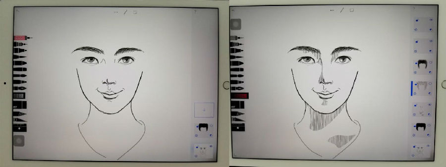画面分层的好处在于可以对某个图层做任何修改而不会影响其它图层,这个优势马上就体现出来了,为了避免视觉干扰,我返回第一个图层把杂乱的轮廓线条擦干净只留下清爽的五官和脸型,然后用自由填充工具为五官、下巴和锁骨加上阴影,画面顿时立体起来