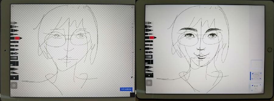 接着,我打算再进一步测试一下软件功能,先给自己画张像体验一下吧。首先,对着镜子用15秒框出头部大致形状。抽象一点也不要紧,因为我发现Sketches作为一个随便玩玩的涂鸦软件,居然可以像专业软件一样实现画面分层,太便捷了!在新建了一个图层之后,我根据之前的定位仔细画好了眉眼鼻。