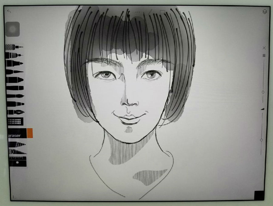 最后是完成头发部分。新建一个图层用铅笔勾画出发丝,再建一个图层用毛笔为头发上色,在毛笔反复的涂抹下,深浅不一的灰色让头型也变得立体起来,不得不说图层真是太好用了!大功告成,这个目光坚定、含而不露、眉宇间一股正气的女子,嘿嘿,比本人更好看一点。
