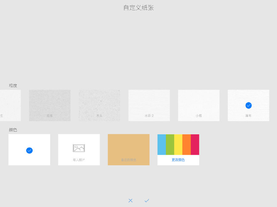 玩过了黑白线稿,我再来试试期待已久的水彩画吧!一不小心,我又发现了Sketches的另一个逆天技能,那就是可以选择在不同纹理和颜色的材质上作画!这其中包括:再生纸、纸板、木头、画布、水彩纸、小格纹、粗颗粒纸等等等等(图5),天啊~这也太应景了吧!既然要画水彩,就得选择相匹配的水彩纸,同时不使用分层功能,干脆完全模拟一次现实中的作画感受。
