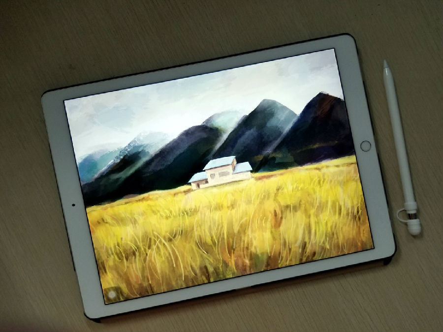 接着,在山川与麦田之间加一幢淡蓝色屋顶的农舍,增添点烟火气息。天空是深秋的灰色,山间若隐若现的藏了一条通往外部的小路。麦田的颜色和纹理需要用笔刷做进一步处理,不过处理完后还要用颜色混合器将细节模糊掉,只用大的色块体现麦田的景深和透视关系,使它远远看起来比较真实。