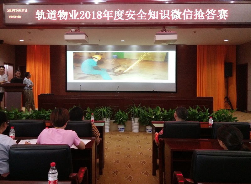 2018年“安全生产月”的主题是?安全色的颜色‘红、蓝、黄、绿’四种颜色分别代表?请指出生产作业现场图片中存在的11处违规操作……6月27日,由轨道物业安全生产委员会联合物业分工会开展的轨道物业2018年度安全知识微信抢答赛在公司26楼火热举行。