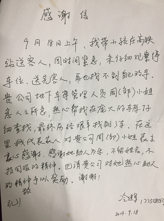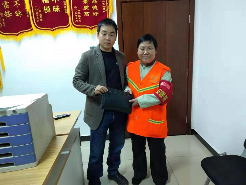 12月16日,东广场保洁员王春秋如常在C出口区域内不慌不忙擦拭栏杆,打扫地面。电话响起,见与人通话的她似面有难色,收费管理员上前询问,“需要帮忙吗?”“正好,正好,快来告诉这位小哥我们这里的位置”......于是,我们在快递小哥那里收到了一面鲜艳艳的锦旗;于是,我们方才知道身边这位每天勤恳打扫,不善言辞的大姐,在12月14日中午工作期间捡到了一个古琦的手包,里面有现金3600元,有几十张银行卡,有大额的承兑票据,有失主刘先生的证件。大姐告诉我们,刘先生是在江西做生意的益阳人,包是早上赶车时掉车位旁边的,当时她见那地面上有牛奶瓶和纸屑便去清扫,结果发现了这个包包,那是个角落里的停车位,平时很少有车停那里的。大姐说:“捡到包我立马交给了值班主管,领回包后的刘先生高兴得声音都发抖了,我才知道他这个包很贵,这些票据更是丢不起。我不懂,我只知道别人的东西不能拿,我就是应当做好自己的事”。大姐轻描淡写地述说,她怎会知道她口中的“应当”让在异乡奋斗的刘先生焦急之后大喜,也是让与她朝夕相处的同事深受感染。