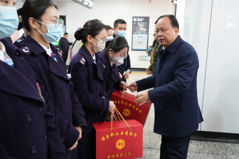 周农一行来到长沙地铁五一广场站,详细了解了春运客流高峰期间地铁运营组织应对情况,仔细询问了春节值守期间员工工作安排和防寒保暖措施,向为城市交通安全、平稳、有序运营作出贡献的地铁员工们表示敬意和慰问,并将一个个温暖大礼包送到运营一线员工手中。他表示,春运期间是出行的高峰,地铁是城市公共交通的大动脉,也是城市文明风貌展示的重要窗口,全体地铁运营工作者要立足岗位,坚持以人民为中心,严格落实好安全生产责任,以最大能力、最实举措、最佳状态为市民乘客便捷出行提供更优服务。