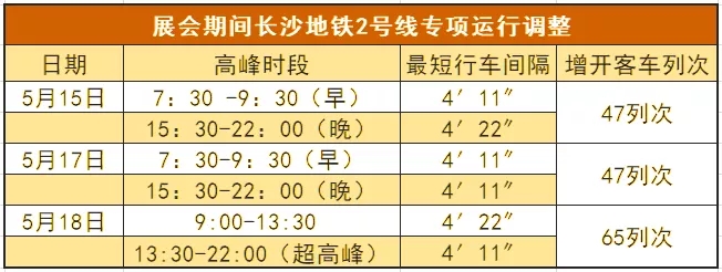 为保障这次盛会的顺利举行,长沙地铁和长沙磁浮快线分别编制了专项运输组织方案,重点做好反恐防暴、突发客流及恶劣天气等应急处置工作。15日、17日、18日将分别增开地铁2号线电客车列次47列、47列和65列,还将视客运需求灵活组织备用列车上线。