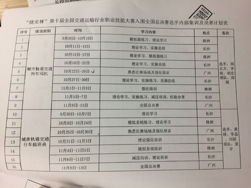 此次大赛由由交通运输部、人力资源社会保障部、中华全国总工会、共青团中央联合主办,也是交通运输行业有史以来职业种类最多、参赛人数最众、覆盖面最广的一次职业技能竞赛活动。此前在湖南省预选赛列车司机项目和行车值班员项目中荣获前三名的6名公司选手周志方、李斌、胡宏、黄靖、李晶和刘娟,经过长达近3个月的集中培训,正式代表全省出战。
