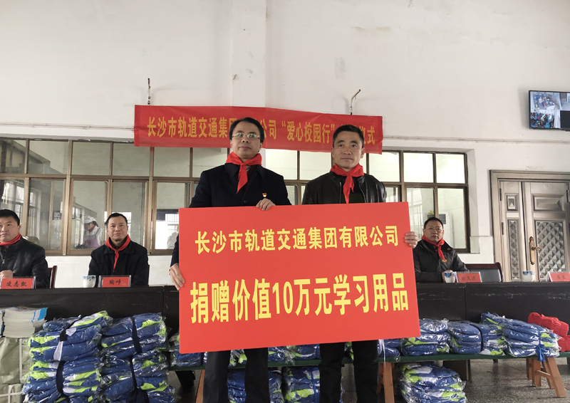 2018年12月13日,由长沙市轨道交通集团有限公司举办的“爱心校园行”捐赠仪式在望城区靖港镇杨家山村浴池小学举行。此次活动得到了集团公司党委与杨家山村村委的高度重视与大力支持,长沙市轨道交通集团有限公司党委委员、纪委书记喻勇兵一行与杨家山村村干部一起见证和参与此次“爱心校园行”捐赠活动。