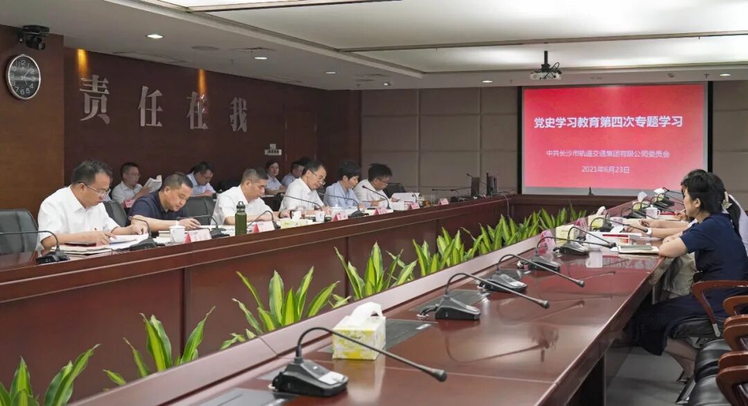 6月23日下午,长沙轨道开展党史学习教育第四次专题学习,围绕“学史力行”主题开展学习研讨,市国资委党史学习教育第一巡回指导组全程督导,市国资委党委副书记、副主任陈军,市国资委办公室(党委办)主任李华,市国资委办公室干部张婷到会指导。会议由公司党委书记、董事长邹刚主持,公司在家班子成员,各党支部书记,运营、磁浮公司基层党委班子成员共同参加学习。