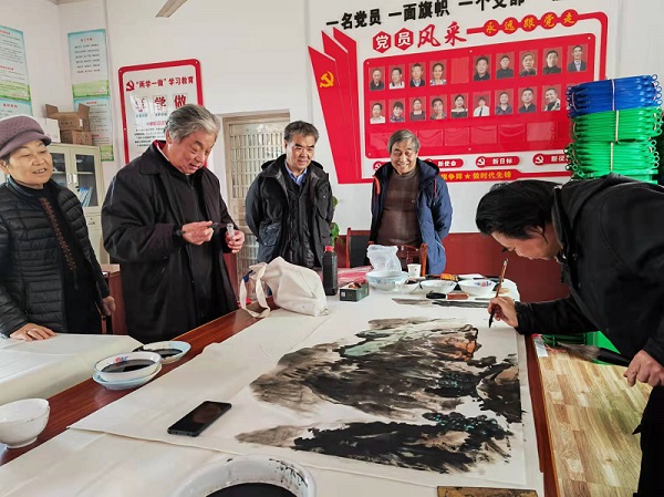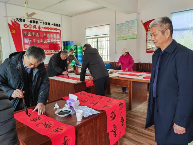 在省委原副秘书长钟万民的带领下,省体委原副厅长周克臣、省直书法家协会主席杨俊武等7名书法家在双藕村村部挥毫泼墨。长桌排开,笔墨铺就,书画家们手中的毛笔龙腾蛇舞,一幅幅饱含着浓浓年味、寓意吉祥的春联福字跃然纸上,把节日的喜庆和福气送到村民手中,也把省直书法家协会、长沙轨道对双藕村的关怀和祝福送到村民心中。