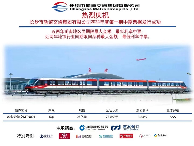 长沙市轨道交通集团有限公司2022年第一期中期票据2022年6月6日获协会审批通过,并于6月17日成功发行,发行规模26亿元,期限5年,票面利率为3.34%。本期债券发行成本创两年以来湖南地区同期限最大金额、最低利率中票及近两年地铁行业同期利率最大金额、最低利率中票。