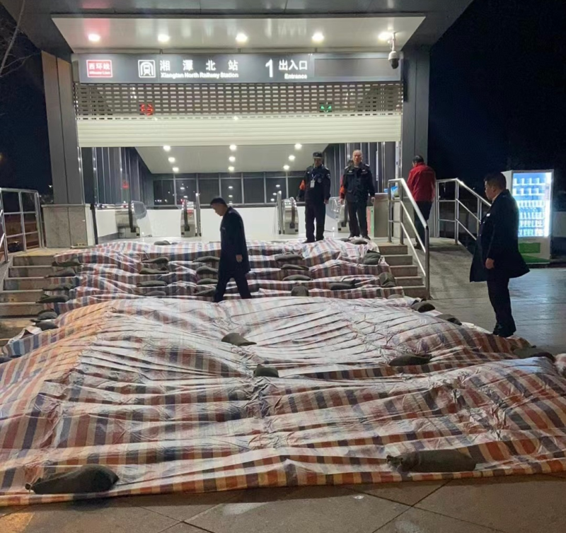 针对高架车站,长沙地铁提前在车站顶棚及天桥安装积雪厚度测量工具及温度计,遇低温雨雪天气,将及时启动防寒防冻应急预警,安排工建专业人员对高架车站雨棚、顶棚等设施以及积雪厚度进行实时监测,及时开展顶棚除冰除雪工作。此外,工作人员还将在出入口及高架站天桥铺设麻袋,在每个出入口安排专人做好除冰扫雪工作,尽力为乘客提供安全的出行环境。