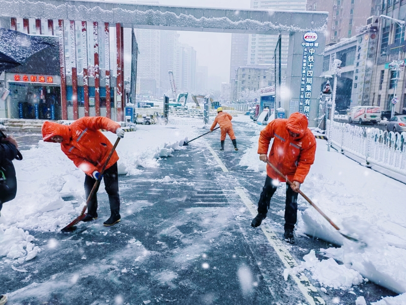 为确保周边群众安全出行,各建设项目大清早便组织工区党员、青年团员及班组人员火速集结,以 “铲雪除冰保安全,党员青年在行动”主题党团日活动为号召,对潇湘晨报、曲塘路、中心医院周边通道、青园路口、林科大、铁道学院、机场高速、芙蓉北路等进行铲雪除冰。暴雪中一抹抹移动的“雪里红”,一条条新开辟的“雪中路”,彰显着长沙轨道的社会担当,映照着轨道建设者的为民初心。