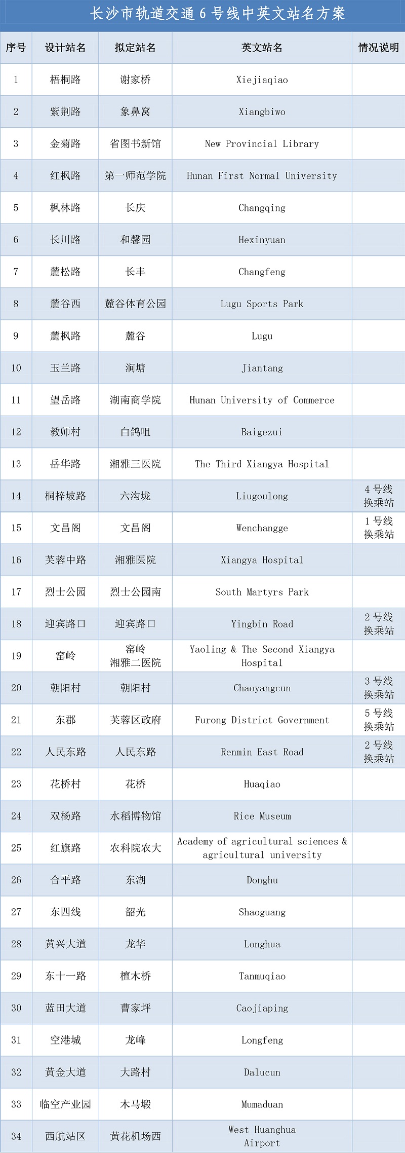 为加强轨道交通站点指位功能,体现长沙地方文化,长沙地铁6号线中英文站名方案经前期征集社会各界意见、组织地名专家会议讨论并报市人民政府批准,现已确定并公告如下: