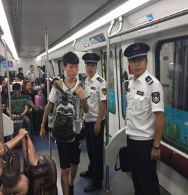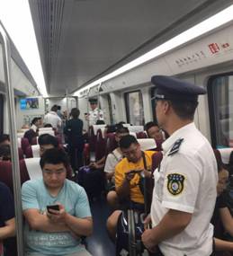 轨巡小队在磁浮列车上对全线进行安全巡查,对车厢内的可疑包裹进行二次安检,及对不文明现象和禁止性行乘客进行劝阻和教育。