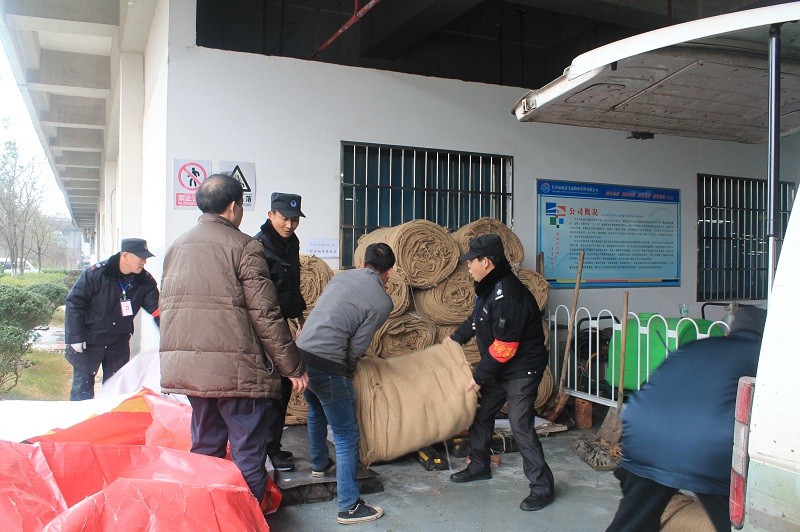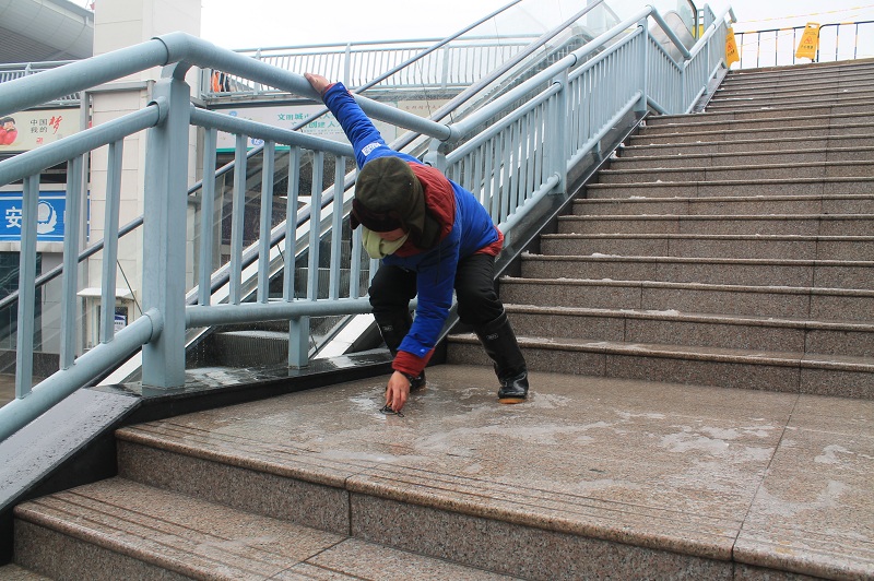 1月25日深夜,长沙地区气温降至-2?,密集的雪籽砸向地面,轨道物业人有备而战,以雪为令,按照预案迅速集结,与外委保安、保洁员工三方形成合力,冒着凛冽寒风,全员出动啦!在火车南站东、西广场平方米的冰雪战场上,他们在值勤巡查,在扫雪除冰,在撒盐作业,在铺设麻袋。雨雪冰冻往往发生在夜间零点前后,及凌晨五点至七点时段,这时是人们酣睡香甜时,而轨道物业所有迎战风雪人员正实行24小时连轴转,至1月26日凌晨五点,先后分班次组织东、西广场保安员86人,保洁员120人持续清扫路面,撒盐1200斤,铺设麻袋1500个,重点防护地段设立安全警戒线8处。