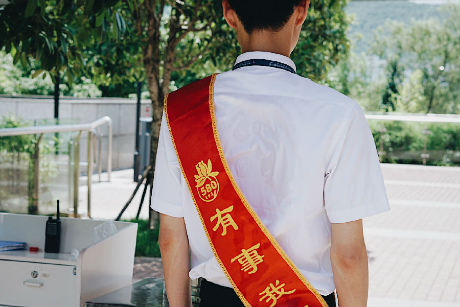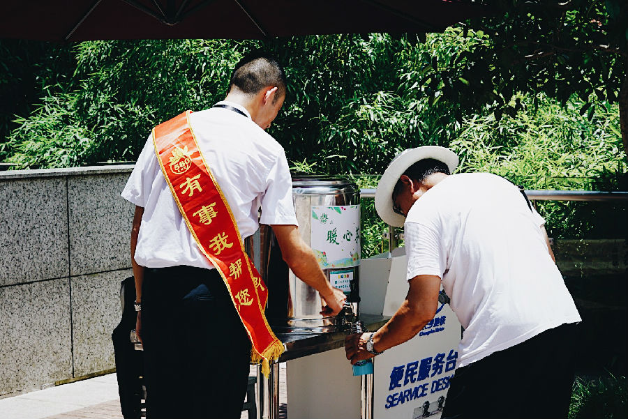 炎炎夏日,“580青莲服务队”不惧烈日酷暑,即使汗水湿透衣背,依然如“铁人”般坚守着岗位。近日,值班站长巡站经过1号口时发现当班队员面带倦容且发白,遂安排其回站内休息。喝过藿香正气水,当班队员仍坚持前往值班地点,而他衬衫背部汗湿的轮廓正好是爱心形状,他也打趣说是自己对乘客爱的表白,更是他坚守岗位的一片初心。能为橘子洲景区游玩的市民递上一杯消暑凉茶,为游人们祛除燥热,服务乘客,正是服务队“夏日行动”的宗旨所在。