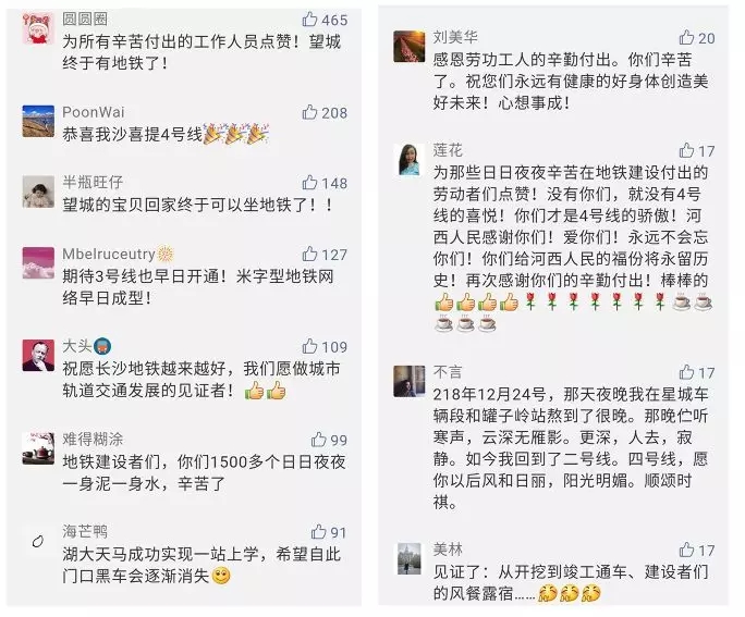 来自望城区的市民乘客留言:“为所有辛苦付出的工作人员点赞!家门口的地铁通啦,望城人民终于有地铁啦。”