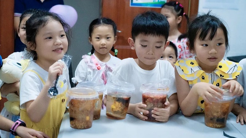 在黄兴车辆段食堂内,孩子们饶有兴致地听着工作人员讲解冰凉粉原材料简介、制作方法及注意事项,并随着现场演示迫不及待地动手实践。先用勺子舀出冰凉粉装进容器,然后添加水果、仙草冻、葡萄干等丰富配料……经过一番“奋战”,最后配上手写的小卡片,一份份“私人定制”的爱心冰凉粉便新鲜“出炉”了。孩子们提着自制的成果,脸上露出满意的笑容。