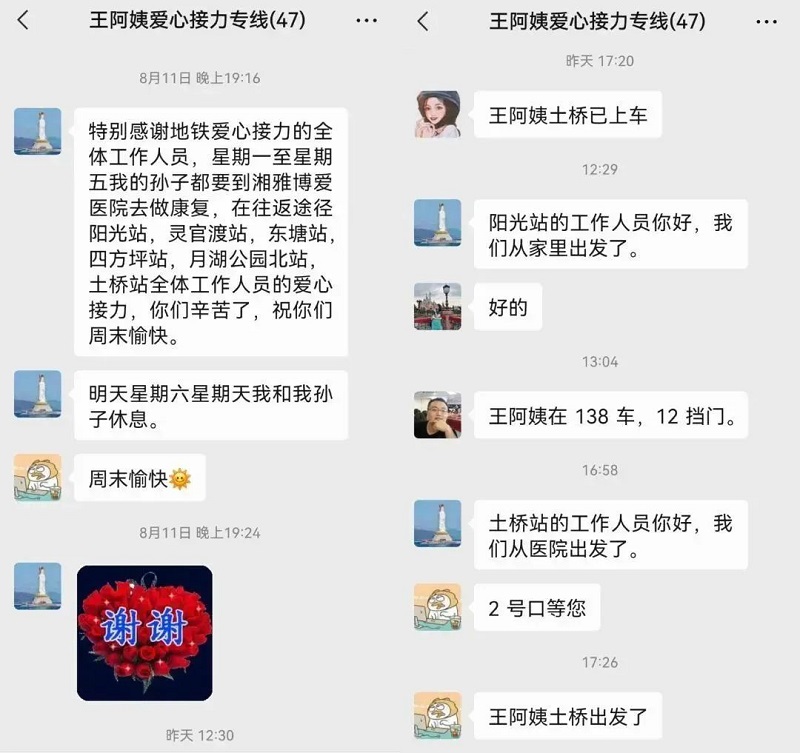 “王阿姨已在土桥站上车”“王阿姨在138次列车,12档门”......今年2月至今,“专线”群里的40余名地铁工作人员风雨无阻坚持护送与陪伴。