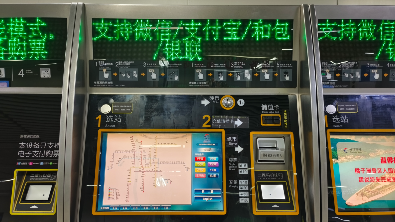 对于未下载以上APP且未持卡的乘客,各站点均配有自助购票机,选择起始站和目的地站点,即可通过现金、微信、支付宝、和包、银联在线支付等方式轻松购买单程票。