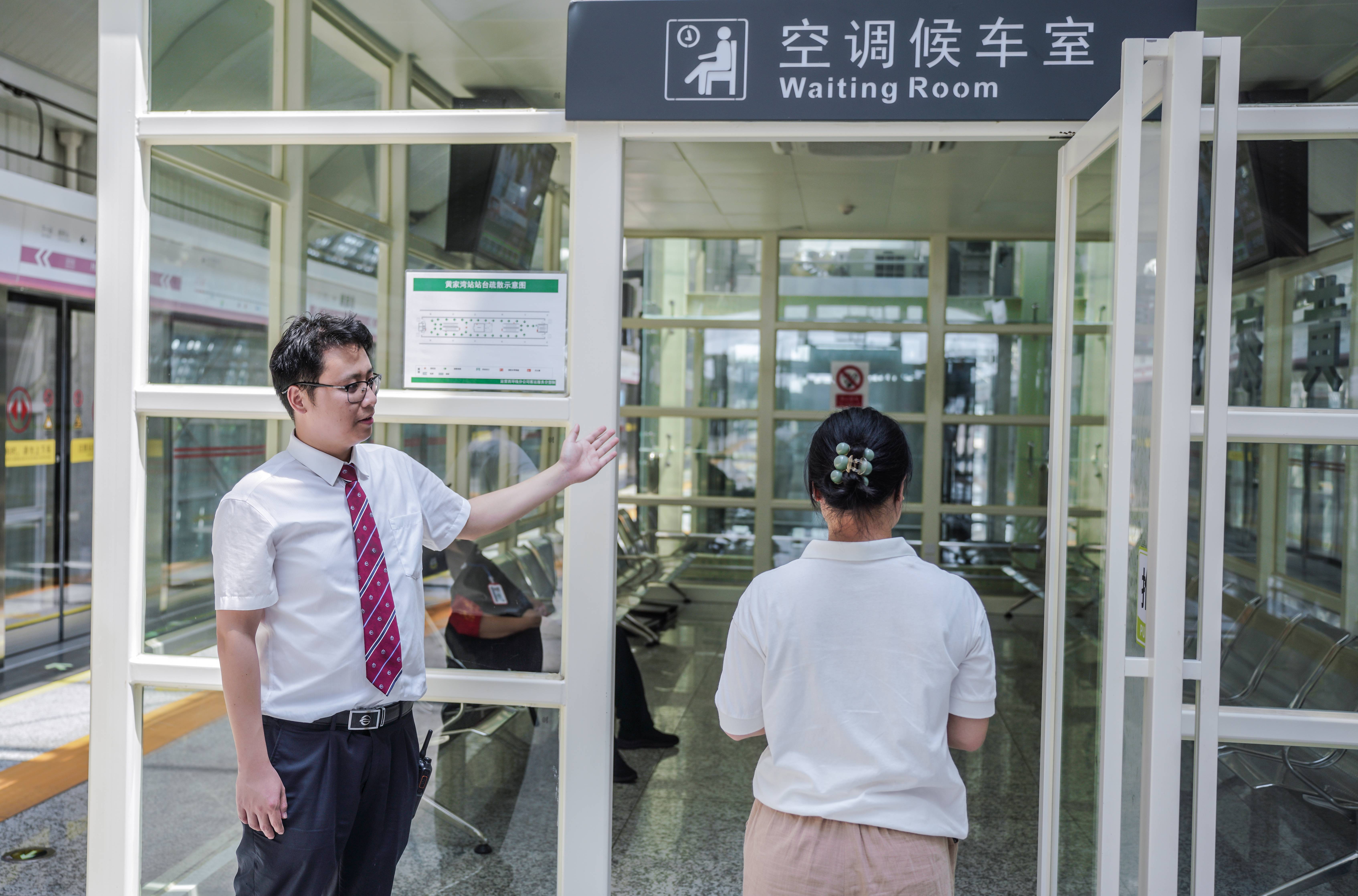“炎”值爆表,汗洒高架。相比地下站,穹顶笼罩下的高架站黄家湾站站台,气温要高上许多。两端气流对冲,热浪扑面而来,站不了多久,站务员李任鑫就已汗流浃背。尽管每半小时与同事轮岗一次,但大家的工装仍旧是干了又湿、湿了又干。“候车室空调开放,您可在这儿候车!”热浪灼人,正在巡站的值班站长彭仑细心引导乘客前往候车室。查看扶梯、垂梯、广播、PIS等是否正常运作;确认各岗位在岗状态是否良好,人员作业是否标准;边巡视车站各个角落,边利用手持台布置工作……一个白班下来,彭仑需要行走2万余步,一层层被汗水浸出的“盐渍”也成了工装上的标配。