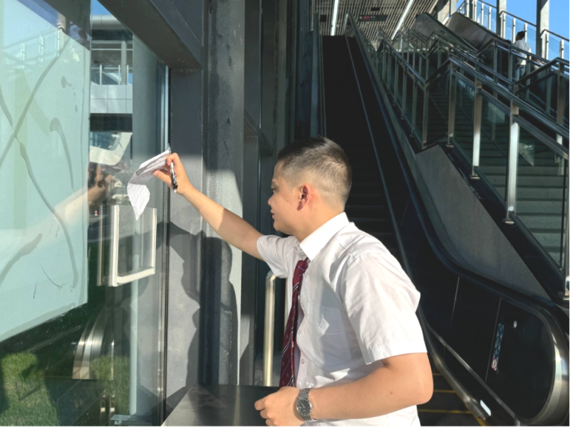 持续的高温天气让1号线北延线高架站站台处在蒸烤模式中。一大早,阳光便透过玻璃顶直射进金盆丘站站台,随着气温持续升高,站台岗李皓楠也开始了“桑拿”体验。金盆丘站是终点站,每一趟列车到站,满头大汗的李皓楠都需要钻进空调效果拉满的车厢,提醒乘客下车,同时留意车厢内有无乘客遗留物品,短短几分钟后,又置身回站台滚烫的热浪里。在冷热交替的温差中,李皓楠与轮岗同事每天接车近百趟。值班站长刘思行,工装总是被汗渍浸成了一块块“地图”,他带着专属“地图”细心引导乘客买票、候车,同时密切关注同事们的身体情况。热浪滚滚,卷不走大家坚守的决心,身处1北高架站,他们热力全开守护市民平安出行。