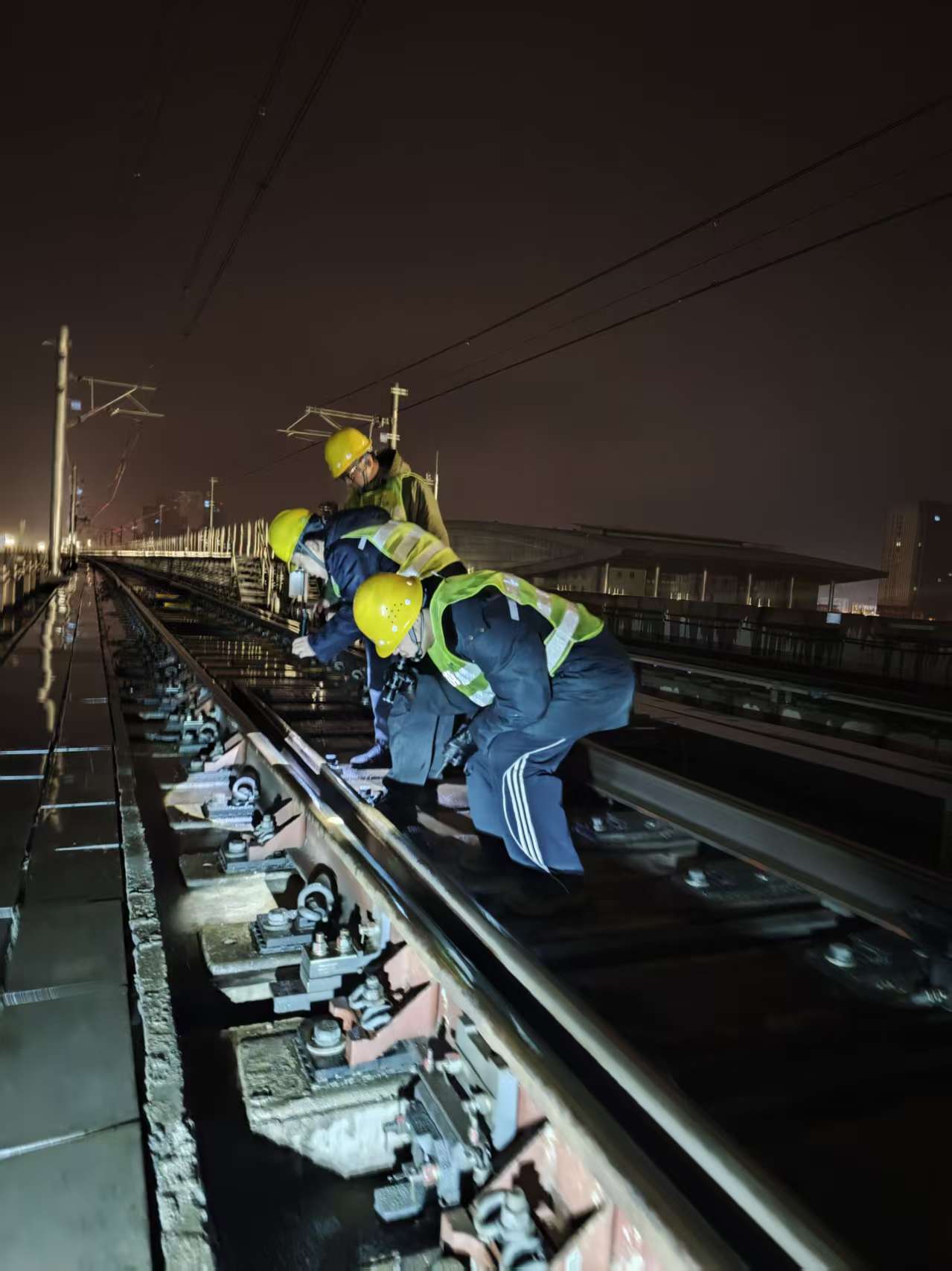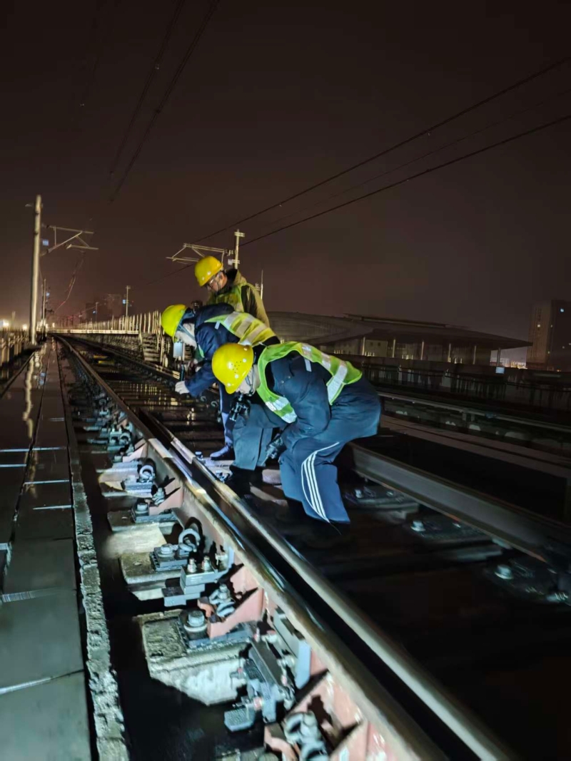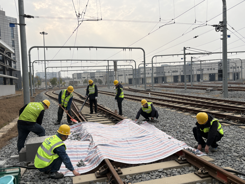 低温雨雪天气,露天段场设备是防寒防冻的关键。线路检修部门对钢轨、道岔、防脱护轨、伸缩调节器等设备开展拉网式排查,重点检测设备抗冻性能。信号检修人员全面检查道岔、转辙机等设备,及时处理密封胶老化、油润不足等问题。接触网检修人员针对雨雪天气可能出现的覆冰、断线等风险,开展多轮专项排查,并在1、3号线高架段设置结冰观测点,实行24小时监测。