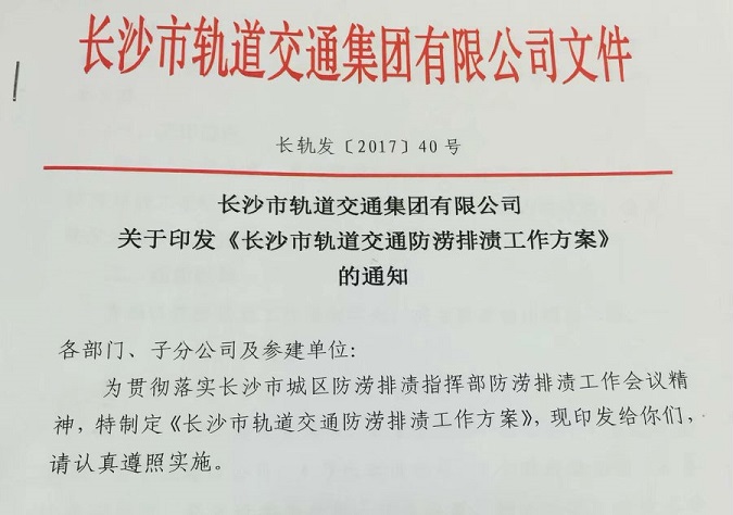 自2017年3月接到天气预警信息后,建设管理部高度重视,及时下发做好防汛工作通知,迅速将防汛列入议事日程,牵头组织召开防汛工作部署会议,成立防涝排渍领导小组,制定并下发了《长沙市轨道交通防涝排渍应急预案》(长轨发[2017]68号)、《长沙市轨道交通防涝排渍工作方案》(长轨发[2017]40号)等防汛文件,强化落实各项防汛责任制。