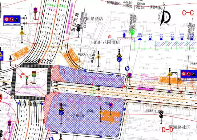 目前,施工围挡临时占用湘雅路路段南、北两侧人行道及黄兴路口东边部分路幅,施工期间黄兴路口及湘雅路交通组织形式基本维持原状不变。