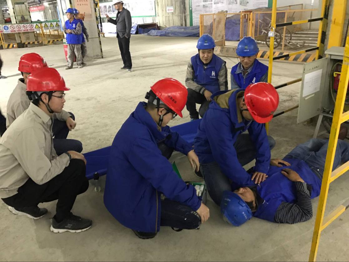 “有人触电啦!有人触电啦!”随着一阵呼救声,触电应急演练正式开始。“安全员”一边高声提醒周边作业人员不要靠近,一边用木棍挑开漏电电缆。洋湖湿地站临电工立即拉掉电闸,禁止无关人员入内;应急救援小组马上展开前期自救,现场工长与120联系……短短十几分钟,“医护人员”对“伤员”进行了人工呼吸及胸腔按压等急救工作,很快“伤员”得到了抢救。