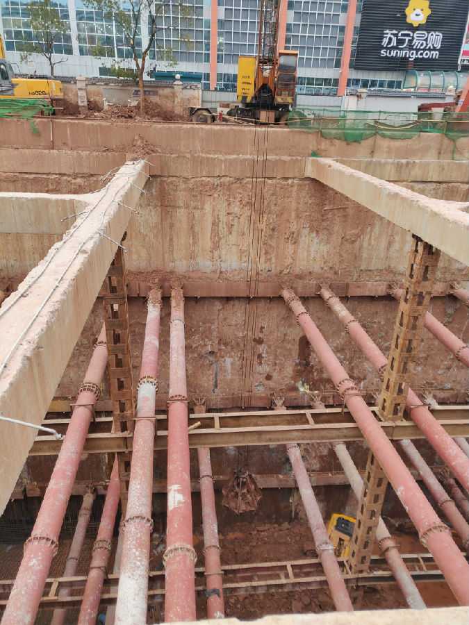 芙蓉区政府站为双柱三跨两层站,与5号线芙蓉区政府站在通道换乘。车站全长285.4m,基坑标准段宽度23.5m,扩大段宽度27.9m,主体结构埋深约为26.79m。车站主体围护结构采用1000mm厚的地下连续墙+4道内支撑方案,基坑变形控制等级为一级,基坑安全等级为一级,基底处于中风化泥质粉砂岩,采用明挖顺作工法,设计土方198000方。