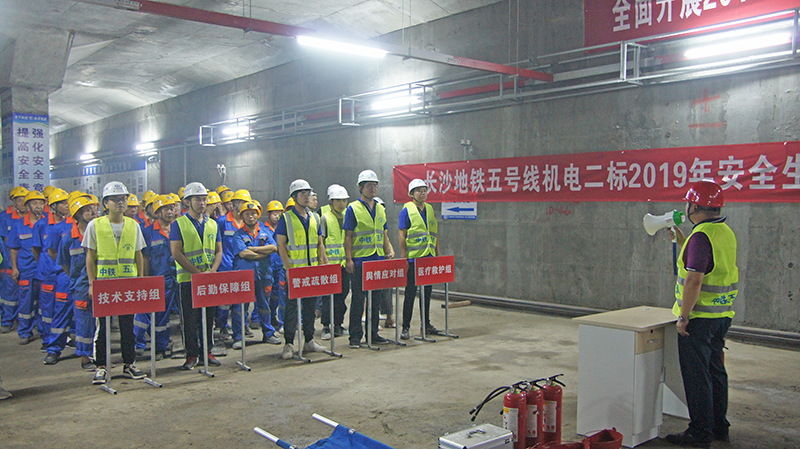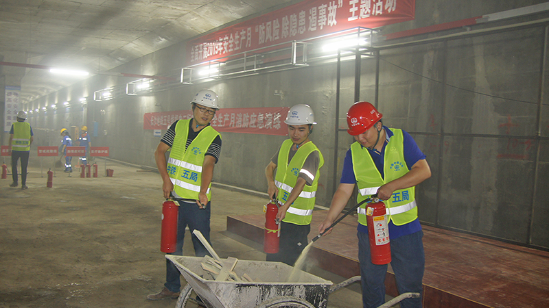 6月26日上午,5号线一期工程紧扣2019年安全生产月“防风险、除隐患、遏事故”主题,在高桥南站举行了安全生产月消防应急演练。机电5标项目部全体工作人员45人参加了此次演练。