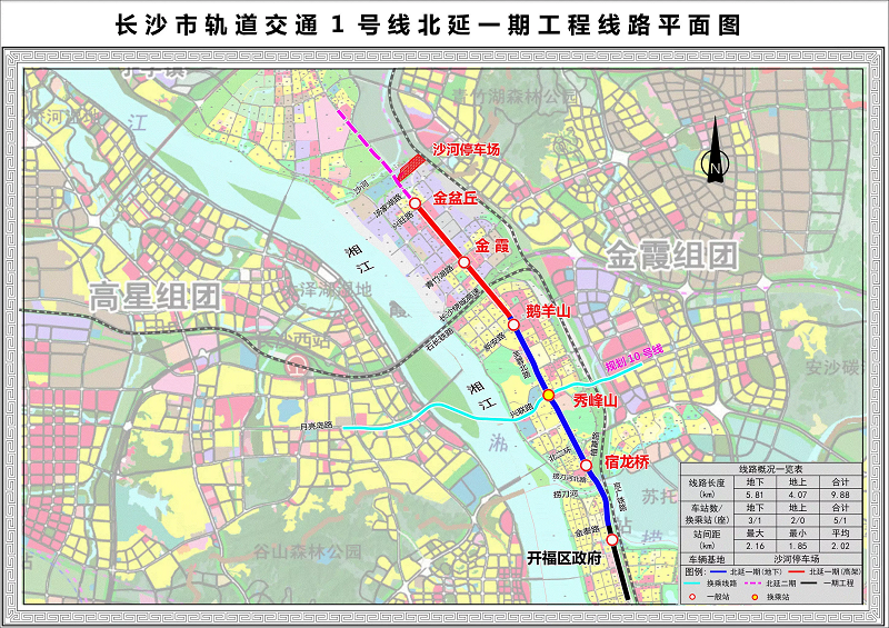 1号线北延一期工程位于金霞组团段,线路起于金盆丘站(原彩霞路站),止于开福区政府站(1号线一期起点站)。线路全长约9.88km,共设5座车站,其中2座高架站,3座地下站。