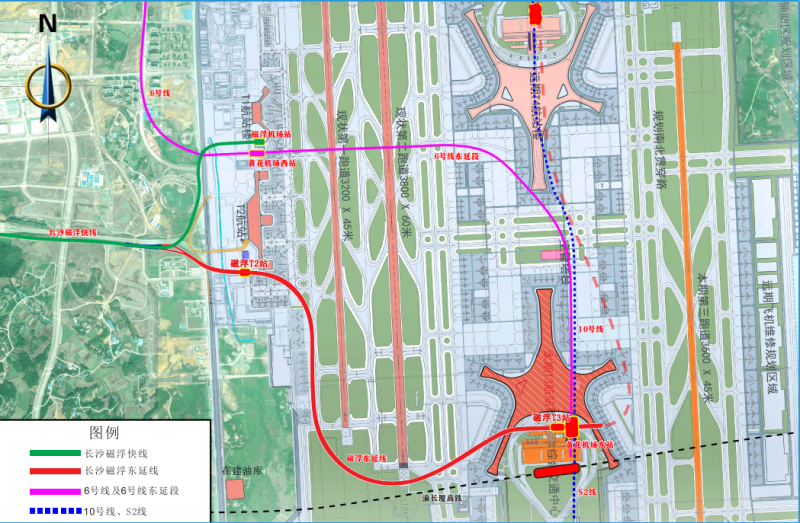 长沙磁浮东延线接入T3 航站楼工程是贯彻落实湖南“三高四新"战略、发展湖南省磁浮产业的重要项目支撑。该工程从既有磁浮快线黄金大道特大桥以东引出,至黄花机场T3航站楼。线路全长4.454公里,其中地下线3.4公里,地面线0.1公里,高架线0.954公里。设车站2座,在磁浮T3站与在建6号线、规划10号线、规划S2线换乘。项目建成后,将实现磁浮高铁站至黄花国际机场T3航站楼点对点快速接驳,促进长沙南枢纽与黄花枢纽联动发展,进一步提升长沙综合交通枢纽战略地位。