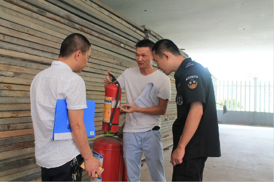 在河西杜鹃路桥下仓库项目,物业安全生产专干仔细查看了消防器材是否符合标准,并指导项目安保兼现场安全员如何正确使用消防器材。