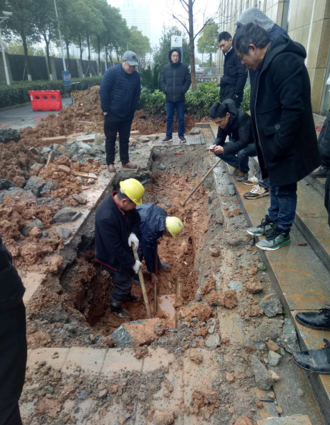 2月13日8点20分,正值早高峰上班时间,轨道大楼在通往地下停车场的入口通道处出现大量积水,且已有积水渗漏至负一层卫生间走道,严重影响员工上班通行。物业公司相关负责人现场查看、排查,确定水源为轨道大楼西侧自来水主供水管道破裂。