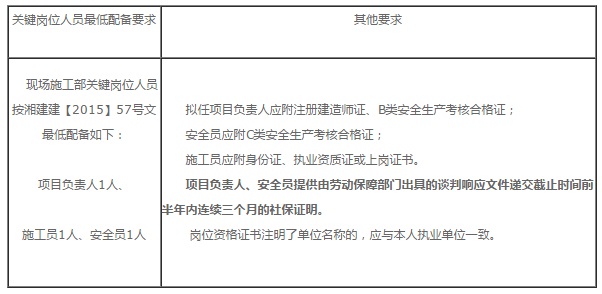 4.本项目现场施工部关键岗位人员最低配备按《湖南省建设工程施工项目部和现场监理部关键岗位人员配备管理办法》湘建建〔2015〕57号文执行。