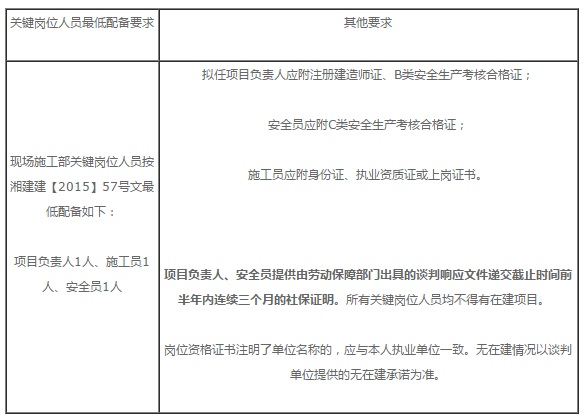 注:在项目实施过程中,现场施工部关键岗位人员配备应按《湖南省建设工程施工项目部和现场监理部关键岗位人员配备管理办法》(湘建建【2015】57号文)的规定执行。