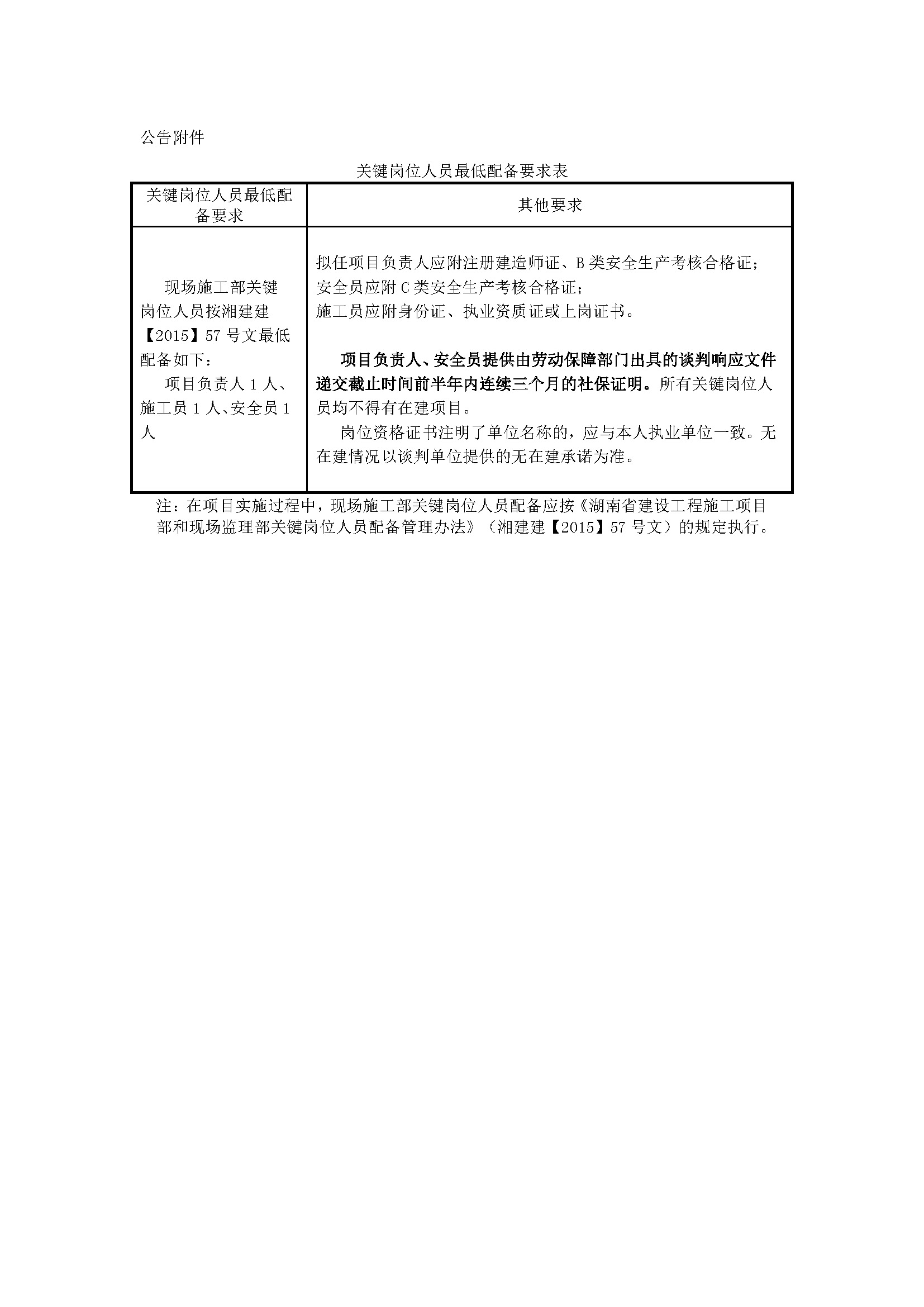 5. 本项目现场施工部关键岗位人员最低配备按《湖南省建设工程施工项目部和现场监理部关键岗位人员配备管理办法》湘建建〔2015〕57号文执行。(详见公告附件)。