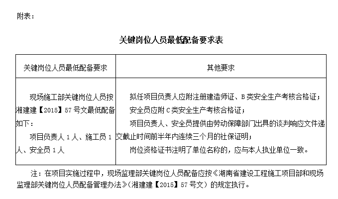 3.本项目现场施工部关键岗位人员最低配备按《湖南省建设工程施工项目部和现场监理部关键岗位人员配备管理办法》湘建建〔2015〕57号文执行(详见附表)。